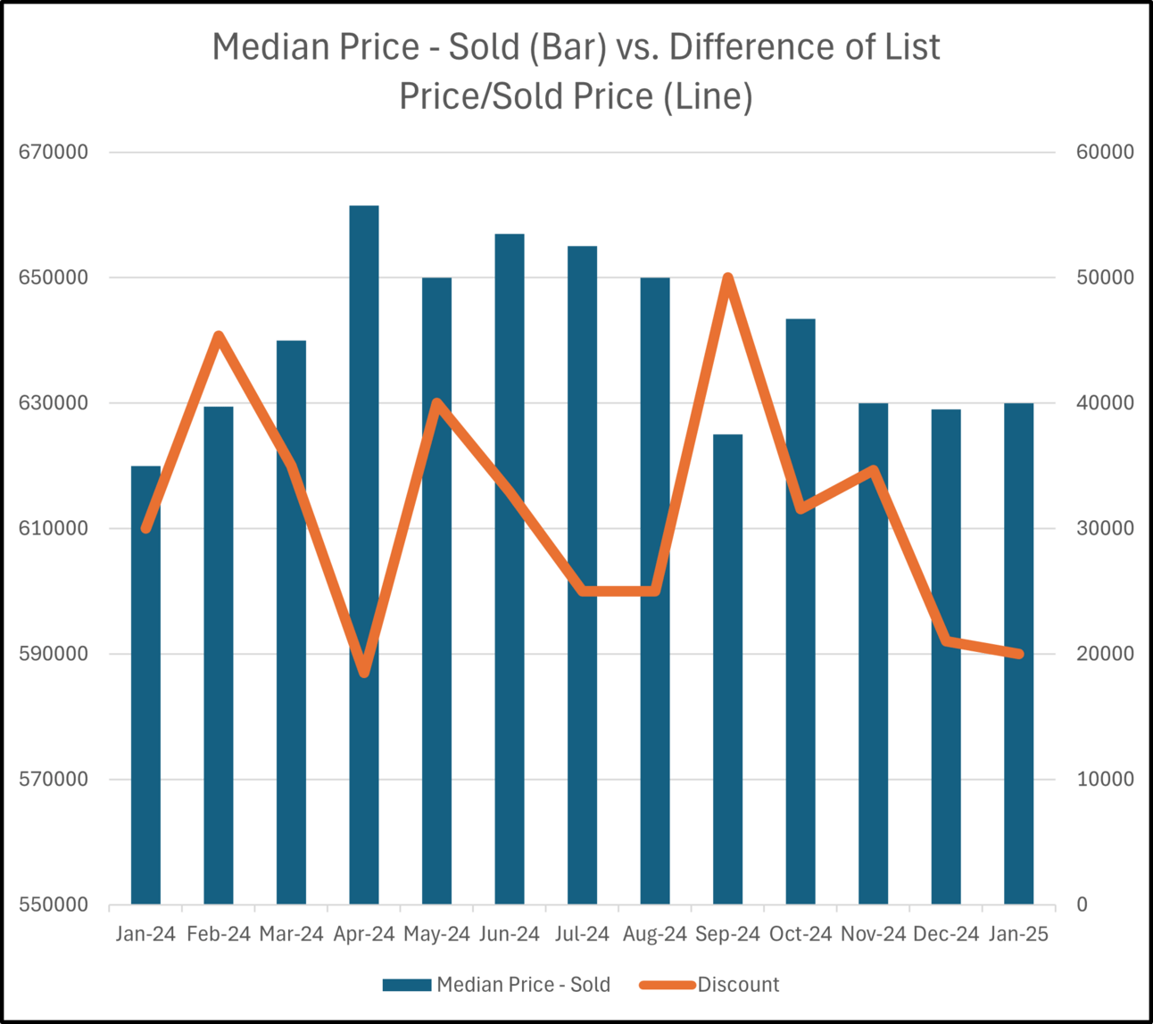 This chart shows that prices in 2024 peaked in April and started a steady decline through December (but still finished positive for the year). At the start of the year, we had declining mortgage rates, rising inventory, and strong buyer demand driving home values higher. Buyers faced more competition, and sellers did not have to discount prices significantly.