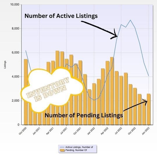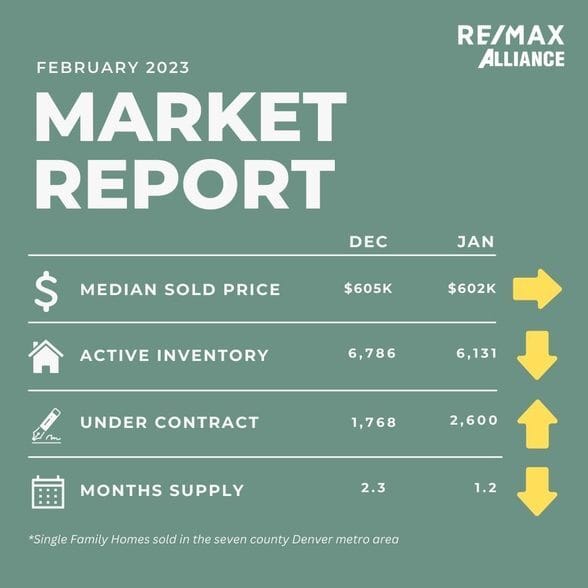 This report shows data for Residential real estate sales in the entire Denver metro area. As of the end of January, home values are stable. The inventory of homes on the market is declining but sales activity (under contract listings) jumped 47%!
